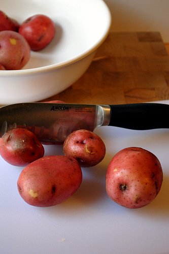 The recipe calls for russet potatoes, but use whichever you prefer. At my house we’re gaga for baby red potatoes. I rarely buy any other kind to just have around the kitchen. Notice these have already felt the harsh reality of my blade. It’s a tough kitchen.