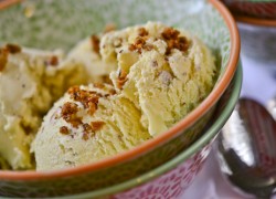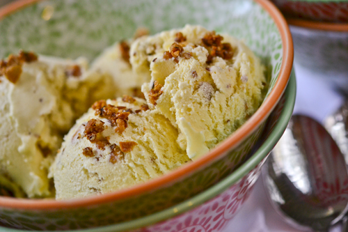 Meanwhile, begin to process the custard in an ice cream maker according to manufacturer’s instructions (or follow The Kitchn’s guide to making ice cream without an ice cream maker). When the mixture is the consistency of frozen yogurt, sprinkle in the nuts and process until it hardens further. My ice cream maker takes about 30 minutes to churn, so we added the nuts twenty minutes into the churning.