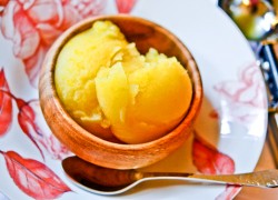 Some reviews for this recipe over at Epicurious stated that the syrup should be well-chilled before churning to achieve a smoother sorbet. We didn’t chill ours for very long at all, so can’t comment for sure on this advice, but if anyone does chill their syrup for a while, please let us know how it turned out. Ours wasn’t terribly icy, but neither was it smooth or approaching creamy at all, not like sorbet I’ve bought in the store.