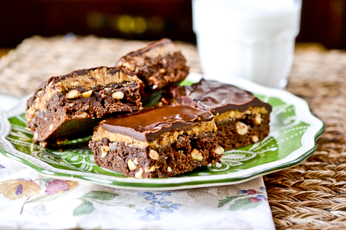 Oh yeah. These are the stuff. Moist. Definitely almost fudgey in the chocolate brownie layer. The peanut butter frosting and ganache are heaven-sent when combined with the brownie layer. These make for some happy tongues. The recipe makes plenty, and one of these rich beauts is really all you need, so be prepared to share.