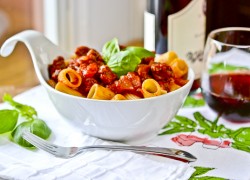 The sauce should reduce by a third to half, with most if not all of the runnier juices from the canned tomatoes having evaporated. Either serve sauce and pasta separately or combine to serve it family style. Garnish with torn basil leaves and the Parmesan cheese.