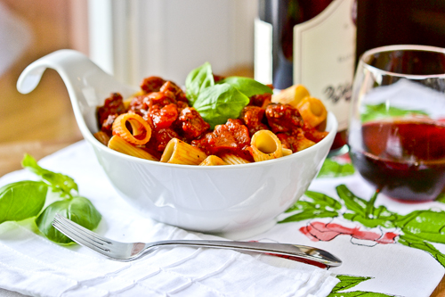 This isn’t going to knock your socks off, probably, but it’s one of our favorite dishes to make at Casa de FFA, and I even came up with it all by myself. Before you clap or oooh and aaahh, it’s just canned tomatoes, a little bit of canned spaghetti sauce, some sliced onions, Italian sausage, a little sweetener to take the edge off the tomato acidity and pasta. That’s it. I do feel, however, that maybe this recipe deserves a little love for it’s simplicity alone. Out of that simplicity comes a wonderful flavor that is rustic and powerfully tasty. Not to mention it’s very do-able on a work night.