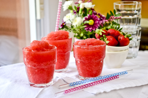 2. Place the strawberry wine mixture in a wide freezer-safe container and cover. Freeze for several hours, stirring the mixture every so often. You’ll know when it’s ready, obviously, by the icy, slushy texture. The only thing is I can’t tell how long this will take since we didn’t use this method, but it’s the same way some recipes suggest for making ice cream and sorbet.