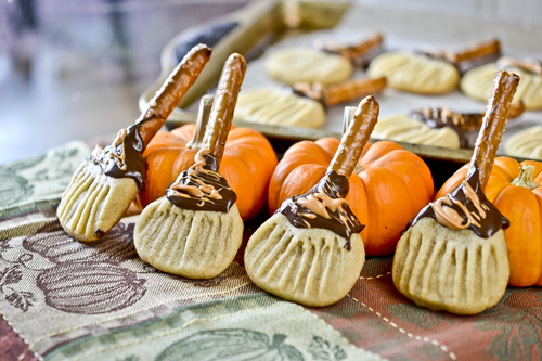 It’s easiest if you roll out all your cookie balls and cut the pretzel rods, which will form the broom handles, first. That way you’re all ready to assemble but you can also feel pleased at being so organized.