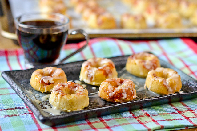 I liked these best after they’d rested a bit, when the glaze had hardened just a little. The bacon was definitely an interesting additive, but I’d also want to try these again as regular-sized donuts. I think the bacon might come across better in a bigger bite. Or maybe I should just make more bacon next time and chomp off an extra bite of it with the bacon-clad mini donut. At the same time. Cuz, really, what’s so odd about that after putting bacon in a donut?