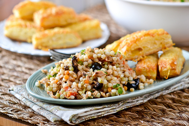 I’m not the biggest fan of canned tuna, so when this recipe piqued the ‘ole radar I was more than a little surprised. But I do love me some couscous, especially the pearl variety, or Israeli couscous as it’s also called. Going down the list of ingredients was like a mini convention of Yes. Too, this just seemed like such a good spring-like thing to try. We made it at the same time as this week’s earlier post and thought the two looked mighty nice together.
