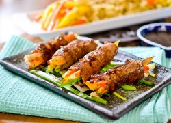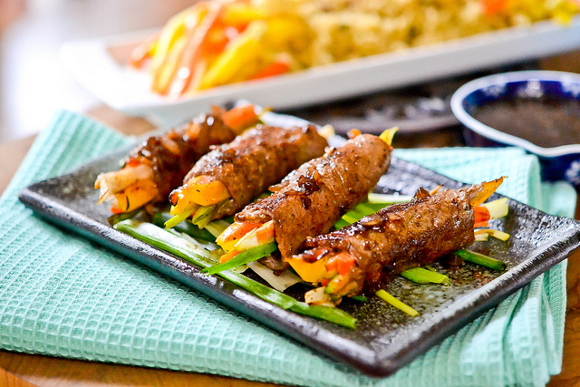 To prep the steak rolls: Take a strip of the marinated steak and lay it with the short side towards you. Place a few of the veggies in the middle and roll the beef up over the filling, securing it with toothpick along the length of the roll. Repeat until all the rolls are assembled.
