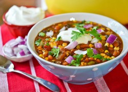 Even though it’s hot enough to melt the shoes right off my feet, I still love the ease and simplicity of a good soup, stew or chili. Normally these are Fall and Winter fare, but just because the seasons have changed, doesn’t mean we can’t use something that can stretch a little over a busy work week. Behold, a delicious vegetarian chili that is really easy, perfectly easy to enjoy (cuz it’s delish), and super easy to make an extra large batch if you have a bigger family. Mine is small, so one regular recipe will keep hubby and I for at least two nights and maybe even lunch for me once or twice. If that’s not a cooking win, I dunno what is.