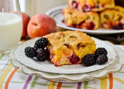 Sis blogging partner and our mom recently made the yearly journey to the peach farm to purchase glorious, summer-ripened peaches. Which means it’s peachy, fruity, sugary dessert time! I wanted cobbler, but not just any cobbler. I, of course, wanted to try something different. I stumbled across this recipe on a search for Southern Living Magazine recipes and wondered who wouldn’t love the idea of fruit cobbler bars. Well, turns out they may have misnamed this recipe, or possibly through some weird cooking thing we did, because it’s more like cake than anything else. Still, it’s definitely like cobbler and it’s warm, and it’s gooey thanks to the sugared peaches and it’s just delicious. And those blackberries, their pop of tartness definitely adds to it all. Be it bars or cake, this one’s a winner.
