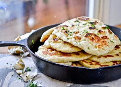 Heat a cast iron skillet over medium-high heat (you need a hot pan, but do make sure you’re not burning your bread; go by your instincts for your stove and skillet). Brush both sides of the naan with melted butter or olive oil. You can also sprinkle on seasonings of your choice at this point. Place the naan on the hot skillet, cover with a lid and cook for 1 minute, until you see bubbles starting to form. Flip and cook for 1-2 minutes on the other side, until toasted spots appear where the bubbles formed. Brush with a bit more butter if desired, then sprinkle with a little kosher salt, fresh cilantro or other herbs. Repeat with the rest of the naan.
