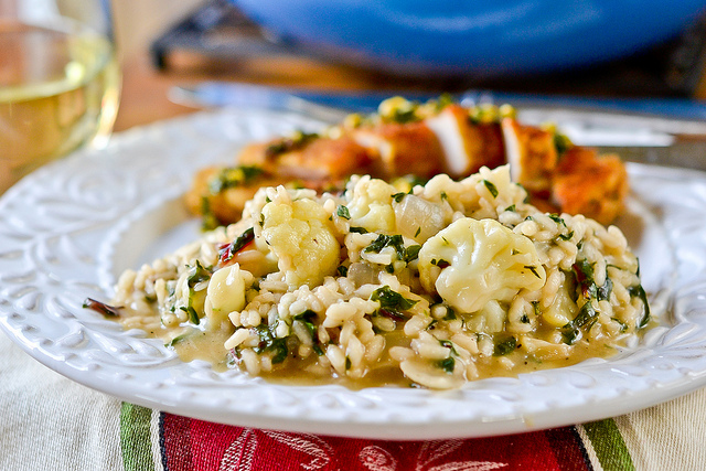 The recipe calls for a half head of cauliflower and this may have accounted for the risotto being a little hard to stir. More on that below, in hindsight, I will probably use a little less than that next time and be sure to break the florets into much smaller pieces.