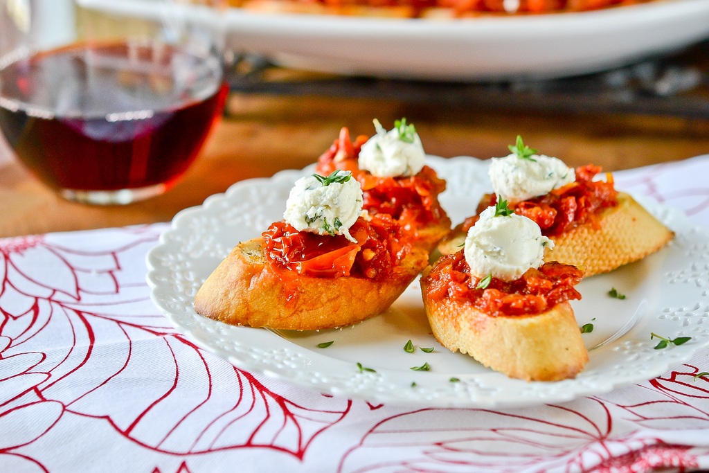 Spread the crostini with Sun-Dried Tomato Jam and top with the goat cheese and herb mixture. Transfer to a serving plate and serve.