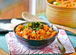 Some Korean foods are served with an egg on top, such as bibimbap, and this rice is no exception. Instead of scrambling the eggs into the rice, try serving a sunny-side-up egg (or one slightly more cooked is fine, too). The Korean way of naming this particular fried rice yumminess is Kimchi-bokkeumbap, and it is all things wonderfully spicy and delicious. I can’t wait to make this again - so I suppose I’d better get to that Asian market again ASAP! This works great as a meal all its own, or you could serve it alongside something else. Have plenty of water at the ready and enjoy.