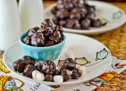 Melt the chocolate in the microwave in 10-20 second intervals, stirring between each, until the chocolate is completely melted and smooth. If the chocolate seems too thick to easily coat the cereal balls, you can add a little of the vegetable shortening, microwaving again briefly to melt it, stirring again until smooth. We used about a tablespoon of shortening per box of chocolate.