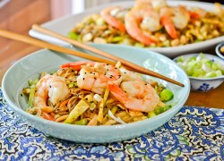 Cook your noodles according to package directions. As soon as they are done, add them to the bowl of vegetables, then pour the dressing over it all and gently toss to combine. Season to taste with salt and pepper and top with the shrimp, then the green onions and peanuts as desired. Enjoy!