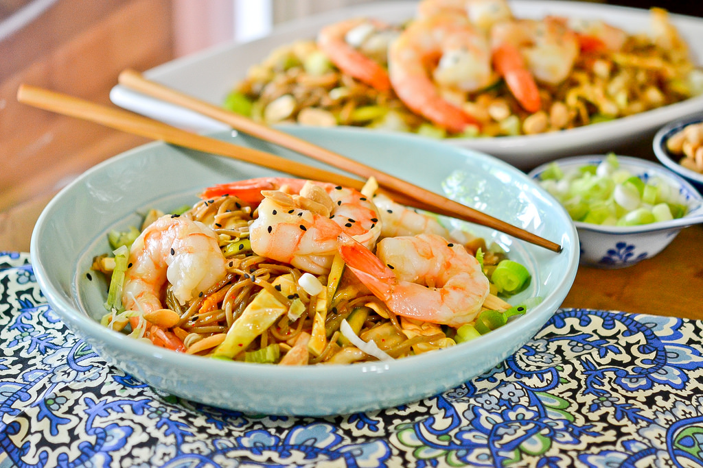 If you’re a fan at all of the flavors in this dish, and of Asian-infused goodness in any way, you’re going to love this noodle salad. Fresh shrimp were the perfect accompaniment!