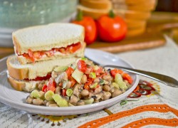 I kind of needed to use some tomatoes up, so we sampled some of the salad with another Southern staple - simple tomato sandwiches! The black-eyed pea salad absorbs some of the flavor of the dressing after chilling in the fridge for a while, so, again, just be aware and have some vinegar, maybe a little more mayo or some of the recipe’s suggested hot sauce to liven it up a little, or maybe set these items out to let guests gussy it up to their liking. Enjoy!