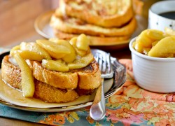 This is an incredibly easy recipe. While it sounds like additional work to make an apple topping for French toast, it’s nothing hard and it’s completely worth it. The apples get cooked a little on their own first with a little butter, then you pour some maple syrup, simmer till the apples are tender and you’re done!