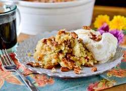 Our cake kind of fell apart a little as we scooped it up for final pictures, but it will keep it’s form better after it cools down a lot more. The texture is soft and the flavor is a lot like a piece of banana bread…but better! And this was easier than some banana bread recipes I’ve tried. There’s a little of a caramelized sauce at the bottom that is decadent. This whole thing tastes decadent, in fact. And I’m making it again ASAP! Because I need it. Pronto! Your mission: make it and get to needing more, too.