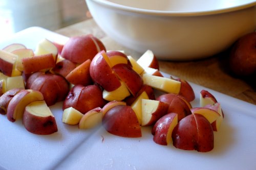 The recipe calls for russet potatoes, but use whichever you prefer. At my house we’re gaga for baby red potatoes. I rarely buy any other kind to just have around the kitchen. Notice these have already felt the harsh reality of my blade. It’s a tough kitchen.