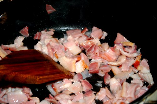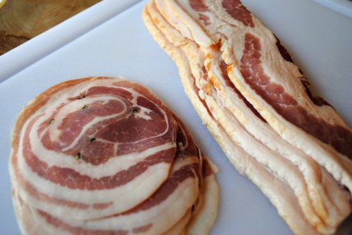 If this is your first experience with pancetta (hey, we all have that first time, don’t be shy), check your grocery store’s deli area, either in the section with the fancier prepackaged meats or see if they can slice some for you behind the deli counter. I swear we only got pancetta in my area about ten years ago. Or maybe that’s just when I started becoming interested in cooking. If you can’t find it no matter how far and wide you search, I would just up the bacon by another slice or two.